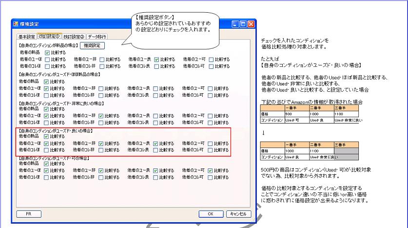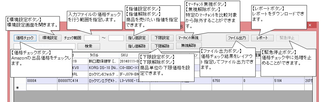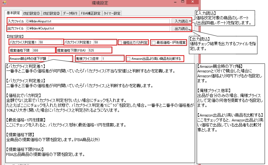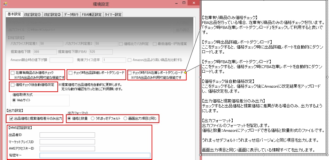 ・入力ファイルの取得方法 アマゾンのアカウントサービスにサインインし、出品レポートページより「出品詳細レポート」をダウンロードしてください。 下記ページにてレポートダウンロード手順を説明しております。 ●価格改定手順の説明 そのA-2 環境設定画面 基本設定(2)