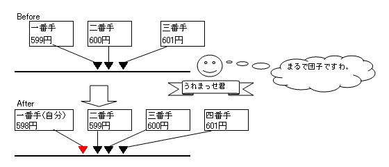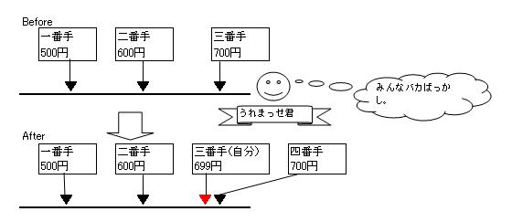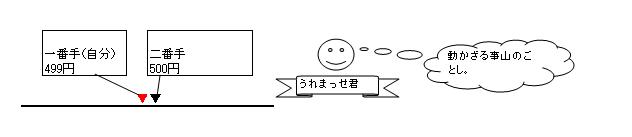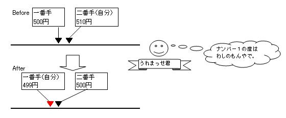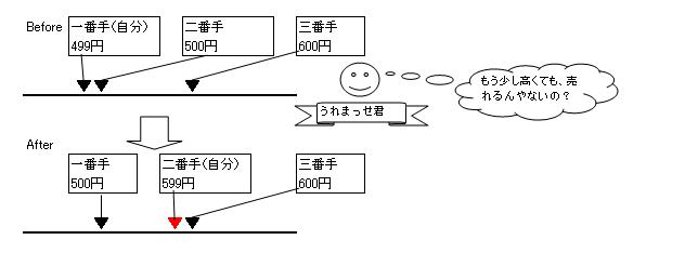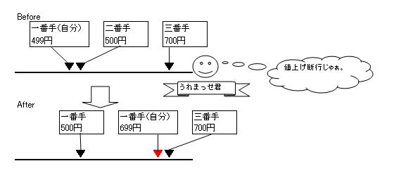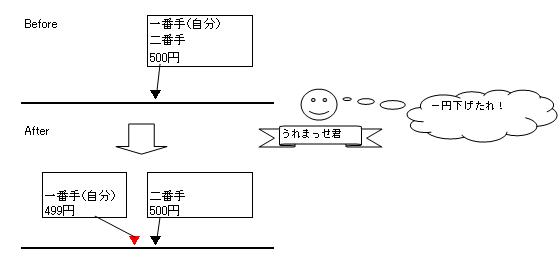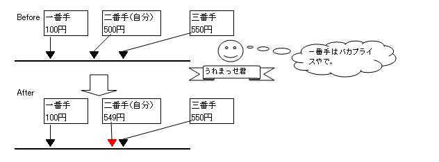 ■価格改定ロジックの解説 うれまっせはさまざまな出品状況を読み取り、各状況に応じて最適な価格設定を提案します。 私が洗い出したパターンとパターン別の処理内容についてまとめてみました。 【ポジションNo.01】 出品価格が一番手価格(最安値)の場合かつ 一番手価格と二番手価格が等しい場合 ・提案価格に二番手価格-1を設定する ![]() 【ポジションNo.02】 出品価格が一番手価格(最安値)の場合かつ 一番手価格と二番手価格の差が二円以上開いている場合 ・提案価格に二番手価格-1を設定する ![]() 【ポジションNo.03】 出品価格が一番手価格(最安値)の場合かつ 一番手価格と二番手価格の差が一円の場合 ・提案価格に一番手可価格を設定する。 ![]() 【ポジションNo.04】 出品価格が一番手価格(最安値)の場合かつ 二番手価格と三番手価格の差がバカプライス判定差額2より大きい場合 ・提案価格に三番手可価格-1を設定する。 ![]() 【ポジションNo.05】 出品価格が二番手価格の場合かつ 一番手価格と二番手価格の差がバカプライス判定差額1より大きい場合 ・提案価格に三番手可価格-1を設定する。 ![]() 【ポジションNo.06】 出品価格が二番手価格の場合かつ 一番手価格と二番手価格の差がバカプライス判定差額1以下の場合 ・提案価格に一番手可価格-1を設定する。 ![]() 【ポジションNo.07】 上記06の価格改定実施後かつ 二番手価格と三番手価格の差がバカプライス判定差額2より大きい場合 ・提案価格に三番手可価格-1を設定する。 ![]() 【ポジションNo.08】 出品価格が三番手価格以上の場合かつ 一番手価格と二番手価格の差がバカプライス判定差額1より大きい場合かつ 二番手価格と三番手価格の差がバカプライス判定差額2より大きい場合 ・提案価格に三番手可価格-1を設定する。 ![]() 【ポジションNo.09】 出品価格が三番手価格以上の場合かつ 一番手価格と二番手価格の差がバカプライス判定差額1より大きい場合かつ 二番手価格と三番手価格の差がバカプライス判定差額2以下の場合 ・提案価格に二番手可価格-1を設定する。 ![]() 【ポジションNo.10】 出品価格が三番手価格以上の場合かつ 一番手価格と二番手価格の差がバカプライス判定差額1以下の場合 ・提案価格に一番手可価格-1を設定する。 ![]() 画面に表示されるポジションの意味の説明