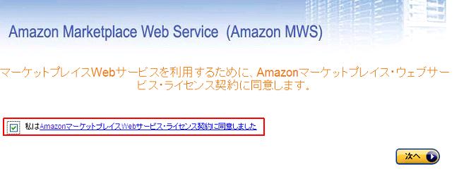 3.「出品用アカウントでマーケットプレイスWebサービスを利用します。」を選択して「次へ」をクリック。 ![]() 4.「私はAmazonマーケットプレイスWebサービス・ライセンス契約に同意しました」をチェックして「次へ」をクリック